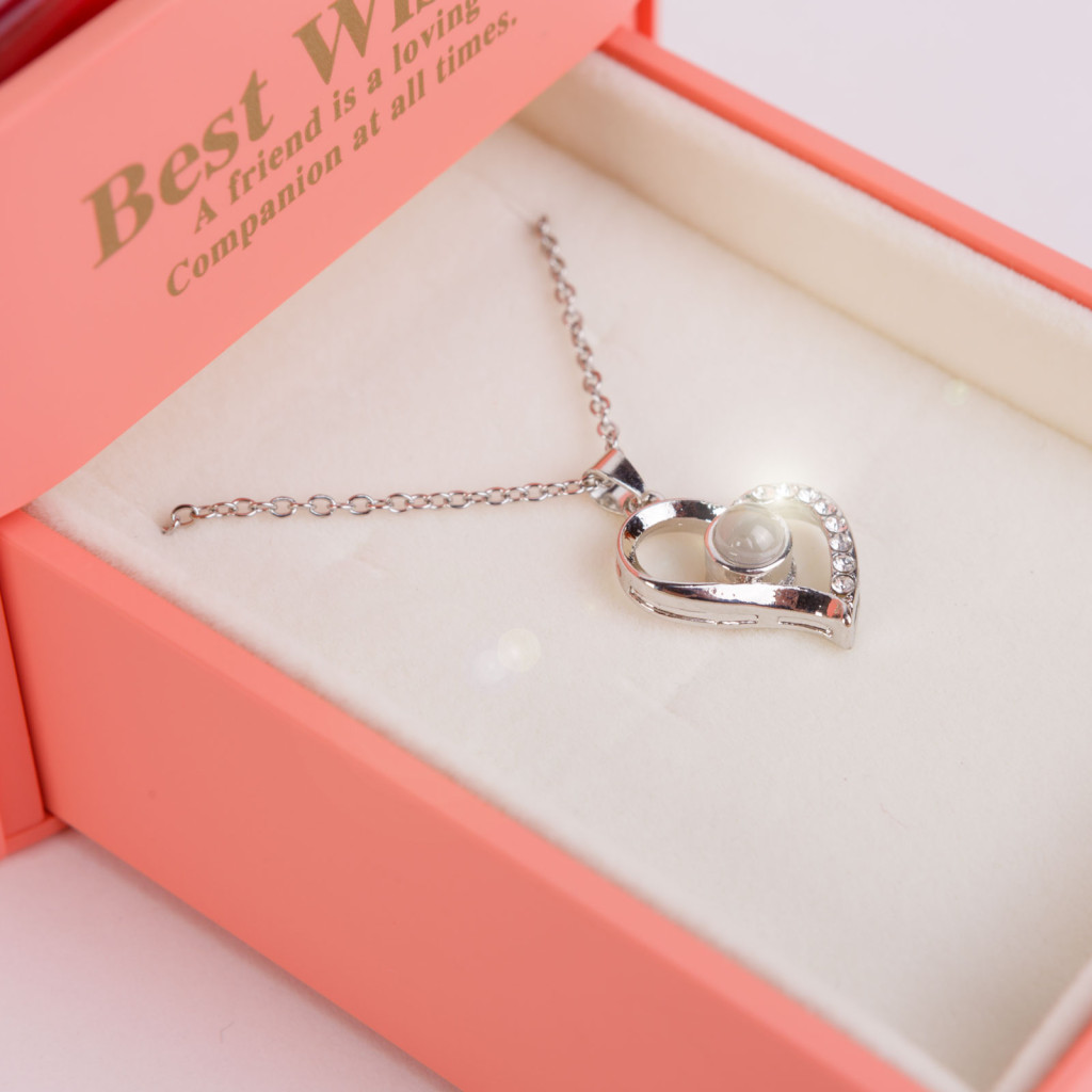 Ez az elegáns ajándékszett tökéletes választás különleges alkalmakra, például évfordulókra, születésnapokra, Valentin-napra, vagy karácsonyra. A csomag tartalmaz 9 db örökrózsát és egy nyakláncot medállal. A „Best Wishes” jókívánság a fedelén egyedi üzenettel egészíti ki ezt az ajándékot. Az alsó rész praktikus tárolóként is használható. Ajándékozzon maradandó emléket, amely mindig mosolyt csal az ajándékozott arcára!