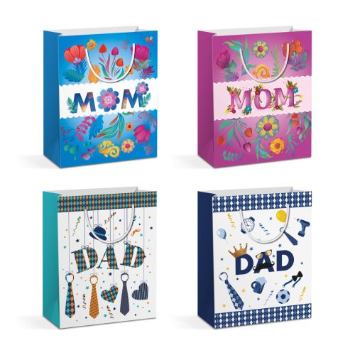Ajándéktasak - papír - 265 x 127 x 330 mm - 4 féle / csomag - 12 db / csomag