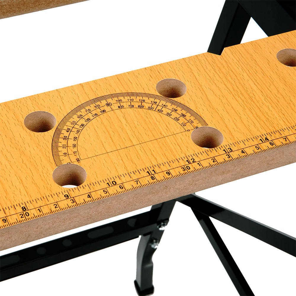 Az asztallap két része közötti távolság tekerőgombbal állítható, így könnyedén rögzíthetsz különféle méretű munkadarabokat. A beépített szögmérő és vonalzó segíti a pontos beállítást, legyen szó fűrészelésről, ragasztásról vagy összeszerelésről.