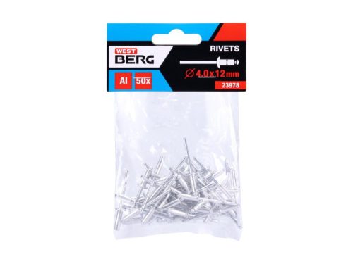 Klasszikus redőny-alumínium szegecsek, átmérő 4,0 mm, hossza 12 mm, 50 db-os kis kiszerelésben, kisfogyasztóknak megfelelő.