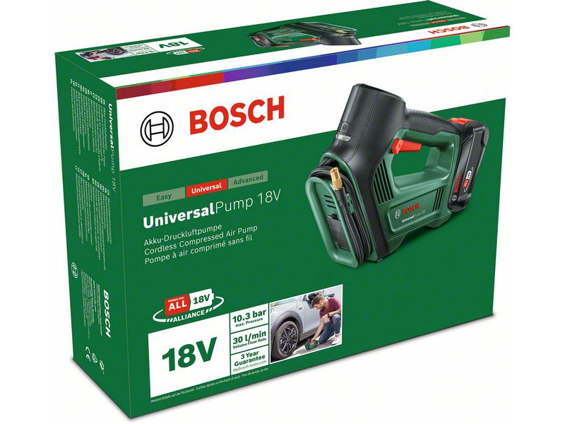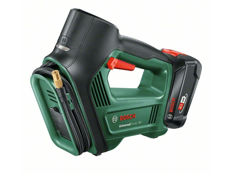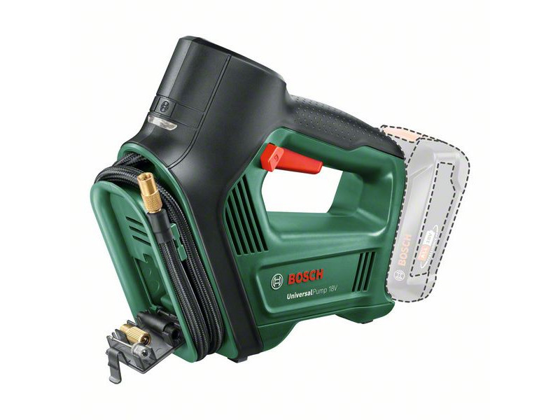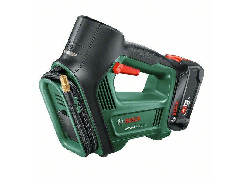 Fújd fel gyorsan a Bosch nagy teljesítményű akkus kompresszorával.Gyors, 30 liter/perces felfújás 10,3 nyomásra intuitív, ujjal történő szabályozással.Kézhez álló, kompakt pumpa folyamatos méréssel, megvilágított kijelzéssel.Tárolás a fedélzeten: a különböző adapterek rendezetten tárolhatók az eszköz elejében.A nagyobb, nagy nyomást igénylő tárgyakat felfújja, például az abroncsokat és labdákat.Megvilágított szelepterület és akkumulátortöltöttség-jelző.Kezdd el a pumpálást: fújd fel az abroncsokat és labdákat pillanatok alatt az akkus UniversalPump 18V segítségével.Ezzel az egyszerűen használható pumpával nem kell többé a helyi töltőállomásig elmenni. Amikor csak szükség van rá, ez a nagy teljesítményű kompresszor minden abroncsot és más felfújható tárgyat pillanatok alatt felfúj..Pofonegyszerű: a UniversalPump 18V az egyetlen eszköz, amire szükséged van a gyors felfújáshoz, percenként akár 30 liter, intuitívan használható és kényelmes. Akkus eszközkét bárhol használható, autó- és kerékpárabroncsokon, illetve más felfújható tárgyon, gyorsan bevethető, és ujjal egyszerűen szabályozható a gyorsindító gomb révén. A megvilágított nyomásmérő jól leolvashatóan megjeleníti a nyomásértékeket: ez főleg fényszegény környezetben jelent kényelmes megoldást. Ha a feladat kész, minden tartozék és a tömlő is közvetlenül az eszköz elejében tárolható. Ez a szerszám a POWER FOR ALL ALLIANCE rendszer része. Egyetlen akkumulátorral nagyszámú, különböző márkájú szerszám működtethető.