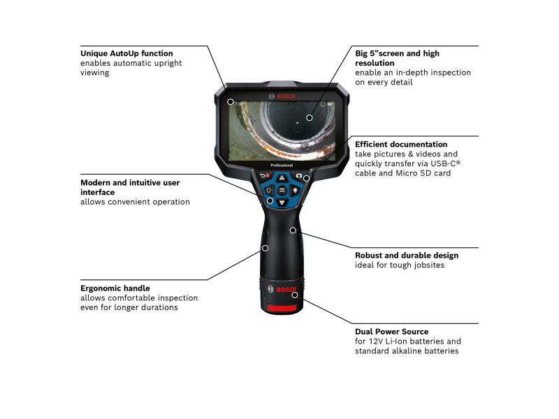 Nagy felbontású kamera és automatikusan felfelé irányba állított nézet az alapos vizsgálathoz és dokumentáláshozA GIC 12V-5-27 C Professional vizsgálókamera újszerű kényelmet biztosít épületgépészek és vízvezeték-szerelők, autószerelők, villanyszerelők számára.Ez az ergonomikus szerszám 5"-os kijelzővel rendelkezik, melynek felbontása igen nagy, 1280 x 720 pixeles, ami a csövek, csatornák és más, nehezen hozzáférhető helyek alapos vizsgálatát teszi lehetővé.A kamerafej nézhet bármilyen irányba, a kép tájolását nem kell használat közben találgatni, hiszen az egyedi, AutoUp funkció automatikusan elforgatja felfelé a képet.A robusztus kamera pornak és víznek ellenálló kialakítású a zord helyszíni körülményekhez. A kamerafej IP67 védettségű, tehát a por és rövid ideig tartó vízbe merítés ellen védett, maga a szerszámtest pedig IP54 védettségű, tehát por és fröccsenő víz ellen védett.A vizsgálókamera tökéletes számos szakember számára és alkalmazáshoz, például elosztódobozok, csövek, falüregek belsejének vizsgálatára, valamint a járműiparban hidraulikus rendszerek és alkalmazások ellenőrzésére.A GIC 12V-5-27 C Professional készülékkel készített fényképek és videók egyszerűen továbbíthatók az USB-C® kábellel vagy micro-SD kártyával.Szállítva: GIC kamerakábel, 8,3 mm átmérőjű, 1,5 m hosszú (1 600 A02 R6M), akasztó, mágnes, tükör, elemadapter (1600A017HF/1600A017HH), 4 x 1,5 V-os LR6 (AA) elem, USB-C™ kábel, Micro SD-kártya, 32 GB Technikai adatok Feszültség (V) 12 Kijelző mérete 5" (1280 x 720 px) Kamerafej átmérő 8,3 mm Kamerakábel hossza 150 cm Látómező 75 ° Adatátvitel USB-C, Micro SD kártya Akkumulátor típusa 4 x 1,5 V LR6 (AA) elem Kamerakábel bemerítése max. 30 perc