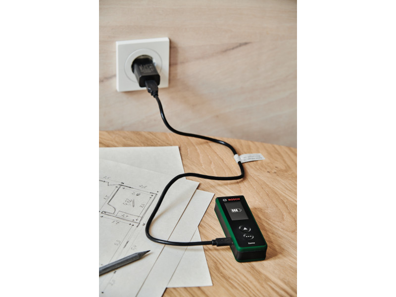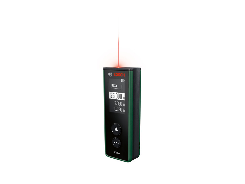 Egyszerűen egyszerűvé teszi a méréstEgyszerű és pontos távolságmérés 25 m-ig, és területszámításTovábbi mérési funkciók a külön megvásárolható szintező-, görgő- és mérőszalag-adapterrelMenti a 10 legutóbbi mérési és számítási értéketAz akkumulátor töltése és a szoftver frissítése az USB-C® csatlakozón keresztülHosszak, felületek és tárgyak egyszerű és precíz méréseA Zamo lézeres mérőműszerrel egyszerűen meghatározható a szoba hossza és magassága a bútorok elrendezéséhez, illetve felújításkor kiszámítható a padló- vagy festékszükséglet. Csak el kell helyezni, rámutatni egy pontra, majd a gomb megnyomásával a Zamo precízen megméri a távolságot akár 25 méterig. Kiszámítja a négyzetmétert is, így nagyon praktikus a tapéta-, padlóigény és más anyagszükséglet kiszámításához. A nagyobb kényelem érdekében ez az egyszerűen használható mérőműszer további mérési funkciókkal is rendelkezik a három, külön megvásárolható, kényelmes adapter használatával: szintezőadapter képek és más tárgyak szintezéséhez, görgőadapter ívek és egyenetlen felületek méréséhez, és egy 1,5 méteres mérőszalag-adapter szabadon álló tárgyak és kerületek méréséhez. A Zamo használata közben nem kell minden mért értéket felírni, hiszen a műszer intelligens módon menti a 10 legutóbbi mérést. Ez a praktikus lézeres mérőműszer mindig friss és használatra kész: a beépített USB-C® csatlakozó kényelmes töltést és szoftverfrissítést tesz lehetővé.A helyiség egyszerű és precíz felmérése egy gombnyomássalA Zamo lézeres távolságmérővel másodpercek alatt lemérhetők a távolságok akár 25 méterigKiszámítja a felülethez szükséges padló, illetve tapéta mennyiségét négyzetméterbenMenti a legutóbbi 10 mérési eredménytEgyszerű töltés és frissítés az USB-C® csatlakozón keresztülaz egyszerűségre összpontosítvaa kicsitől a közepes méretű feladatokiga funkcionalitásra és a teljesítményre összpontosítva a feladatok szélesebb körénélközepes méretű feladatokhoza legjobb teljesítmény továbbfejlesztett funkciókkalnagyobb és több kihívást jelentő feladatokA Zamo funkciói és előnyei Lézeres pontosság a távolságok gyors meghatározásáraMagasság, hosszúság és más távolságok precíz mérése a Bosch lézertechnológiájával.Pontos mérés 25 méterigA 0,15 m és 25 m közötti távolságok +/-2 mm pontossággal mérhetők. A mérés kiindulópontja a műszer hátsó éle.Nagyobb funkcionalitás a praktikus adapterekkelAz adaptercsatlakozó lehetővé teszi három Zamo adapter csatlakoztatását: szintező-, görgő- és mérőszalag-adapterét. Ezek a funkciók ideálisak kisméretű tárgyak szintezéséhez a falon, kerületméréséhez, illetve textil méretének meghatározásához.Egyszerű töltés és szoftverfrissítésAutomatikus területszámításGyors hozzáférés a mentett mérési értékekhez Technika adatokLézerdióda635 NmLézerosztály2Mérési tartomány0,15 – 25,00 mMérési pontosság± 2,0 mmMérési idő, tipikus0,5 sMaximális mérési idő4 sAkkumulátor2 x 1,2 V HR03 (AAA)Kikapcsolási automatika5 percSúly0,080 kgA szerszám méretei (h x sz x m)104 x 38 x 23 mm Szállítási terjedelem: 2 x 1,2 V HR03 (AA) tölthető elem