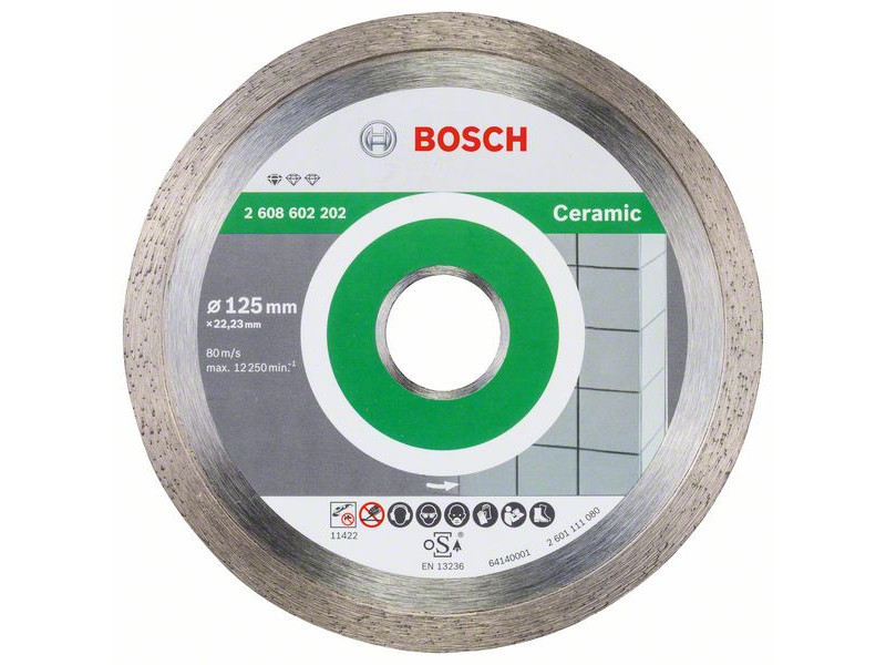 Csempék megbízható vágása - A Standard for Ceramic gyémánt vágótárcsa csempék megbízható vágására szolgálFolytonos vágópereme mindenfajta csempe pontos vágását biztosítjaEmellett a Bosch svájci gyémánt fejlesztőközpontja biztosítja a tárcsa kiváló minőségétA tárcsa kerámia, porcelán és finomkerámia vágására használható22,23 mm-es furattal normál rögzítőanyás sarokcsiszolókhoz