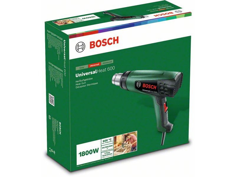 Sokoldalú hőlégfúvó számos feladathoz. A levehető védőpajzsnak köszönhetően alkalmas a szűk helyeken való munkavégzésre. A UniversalHeat 600 fűtőeleme gyors felfűtést és egyenletes hőeloszlást nyújt a kiváló teljesítményért. Emellett a három fokozatú be- és kikapcsoló gombbal különböző hőmérsékletek és légáramok állítható be. A többféle fúvókának köszönhetően a hőlégfúvó számos feladathoz használható, mint például festékeltávolítás, vízcsövek kiolvasztása, gyomirtás, tömítés szárítása, kábelzsugorítás, kreatív projektek.