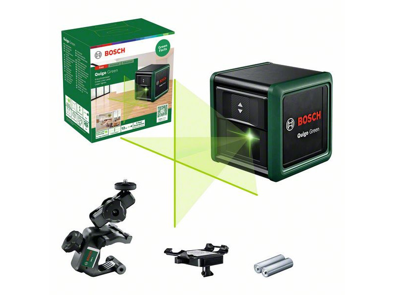 Zöld lézertechnológia a piros lézervonalakhoz képest akár 4 x jobb láthatóságért világos fényviszonyok között is.+/- 0,6 mm/m-es javított pontosság és maximum 12 m hatótávolság.Könnyű pozicionálás az adapterlappal és az univerzális MM 2 szorítóval.Tökéletes képek felakasztásához, csempézéshez, függönykarnis beállításához, konyhai bútorok felszereléséhez.Fenntarthatóságot elősegítő tulajdonságokkal rendelkezik, további részletek az alábbiakban találhatók.Az egyszerű csúszókapcsolós működtetésű Quigo Green önmagától beáll a világos fényviszonyok között is kiválóan látható zöld lézervonalak vetítésére. Ez a kereszt vonallézer a Bosch kiindulópontja, ha az elektromos kéziszerszámok fenntarthatóságáról van szó..Zöldülj be teljesen a Bosch új generációs Quigo Green kereszt vonallézerével, amely kiváló láthatóságot és könnyű kezelhetőséget biztosít a barkácsprojektekben. Élénk, zöld kereszt lézervonalaival a Quigo Green tökéletes beállítási megoldás az igen világos fényviszonyok közötti munkavégzéshez. +/- 0,6 mm/m-es megnövelt pontossággal és maximum 12 m-es hatósugárral rendelkezik. A még nagyobb kényelem érdekében ez a sokoldalú keresztvonalas lézer egy MM 2 univerzális szorítót és egy adapterlemezt tartalmaz az egyszerű rögzítéshez. A Quigo Green +/-4°-os tartományon belül szintezi saját magát a tükrök, polcok vagy csempék egyenes beállításának szavatolásához.