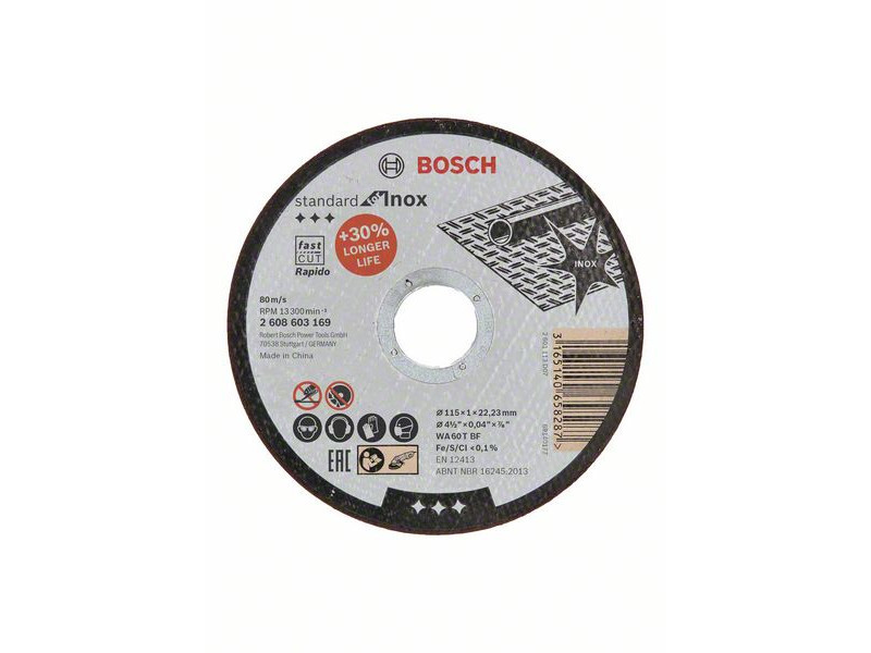 Megbízható teljesítmény - A Standard for Inox Rapido vágótárcsa megbízható teljesítményt nyújt rozsdamentes anyagoknálVékony vágóéle sima és könnyű vágást eredményezEmellett a tárcsa nem tartalmaz vas- és kéntartalmú, sem klórozott töltőanyagotEz a tárcsa rozsdamentes anyagok vágásához használhatóSarokcsiszolókhoz használhatóA Bosch vágótárcsák a szigorúbb biztonsági követelményeknek is megfelelnek, teljesítik például az EN 12413 előírásait22,23 mm-es furattal normál rögzítőanyás sarokcsiszolókhoz