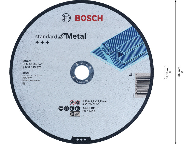 A Standard for Metal vágótárcsa megbízható teljesítményt nyújt fémek megmunkálása esetén A tárcsa általános fémvágáshoz használható alumíniumoxidból készül A Bosch vágótárcsák a szigorúbb biztonsági követelményeknek is megfelelnek, teljesítik például az EN 12413 előírásait 22,23 mm-es furattal normál rögzítőanyás sarokcsiszolókhoz
