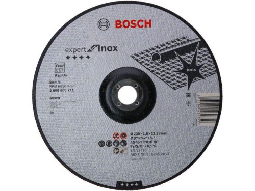 Gyors vágás - Az Expert for Inox Rapido vágótárcsa a rozsdamentes anyagok gyors vágását teszi lehetővé a legnagyobb biztonsággalA tárcsa szuperkemény alumíniumoxidból készül, funkcionális töltő-, és adalékanyagokkal korszerű fenolgyantábanEmellett a vékony tárcsa nem tartalmaz vas- és kéntartalmú, sem klórozott töltőanyagotPrecíziós gyártású üvegszál hálója a munkavégzés maximális biztonságát garantáljaEz a tárcsa rozsdamentes anyagok vágásához használhatóSarokcsiszolókhoz használhatóA Bosch vágótárcsák a szigorúbb biztonsági követelményeknek is megfelelnek, teljesítik például az EN 12413, a FEPA és az oSa előírásait22,23 mm-es furattal normál rögzítőanyás sarokcsiszolókhoz