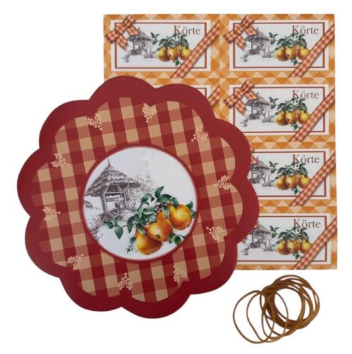 Befőtt díszítő csomag A csomag tartalma: -10db öntapadós címke a befőttes üveg oldalára (8,5 x 4,5 cm)-10db befőttes gumi -10db befőtt címke tetőre (17,5 cm átmérő)Az ár egy csomagra vonatkozik!