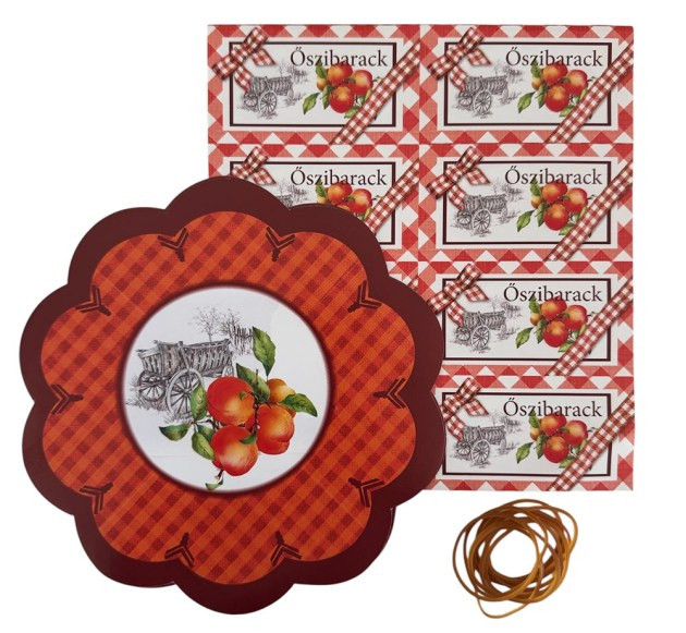 Befőtt díszítő csomag A csomag tartalma: -10db öntapadós címke a befőttes üveg oldalára (8,5 x 4,5 cm)-10db befőttes gumi -10db befőtt címke tetőre (17,5 cm átmérőjű)Az ár egy csomagra vonatkozik!