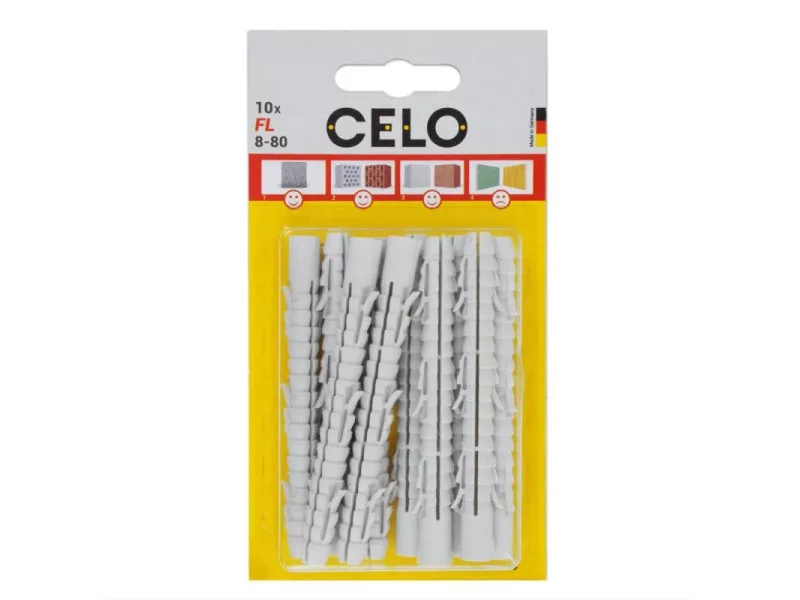 A CELO FL extra hosszú nylon dübel hosszú tágulási szakaszának köszönhetően egyformán használható tömör és üreges építőanyagokban, vagy porózus szerkezetekben (pl. öreg épületek). A gallér nélküli fejrész lehetővé teszi az átmenő szerelést. A szárnyas kialakítás megakadályozza az elforgást a furatban. A dübel kiváló minőségű, öregedésálló nylonból készül.Alkalmazások Lámpák Villanykapcsolók Fali fogas Fali szekrények Postaláda Függöny sín Szaniter rögzítések Korlát TV tartó FestményekTovábbi specifikációkFőbb jellemzők: Hosszú tágulási szakaszának köszönhetően egyformán használható tömör, üreges és porózus építőanyagokban is A többszárnyú kialakítás biztosítja az elforgás elleni védelmet Előre telepített és átmenő szereléshez is alkalmas. Alkalmas vékony szigetelések, vakolatok stb. áthidalására csökkentett furatmélységgel Kiváló minőségű és öregedésálló nylon Hőállóság: -40°C-tól +80 °C-igAlapanyagok: Beton Természetes kő Tömör tégla Tömör mészhomok tégla Könnyű, tömör beton blokk Gipsz blokk Üreges tégla Üreges mészhomok tégla Könnyű, üreges beton blokk Pórusbeton GipszkartonTechnikai adatok Anyag Nylon Furat átmérő (mm) 8 Furat mélység (mm) 90 Rögzítési mélység (mm) 80 Dübel hossz (mm) 80 Csavar átmérő (mm) 3.5-5.5