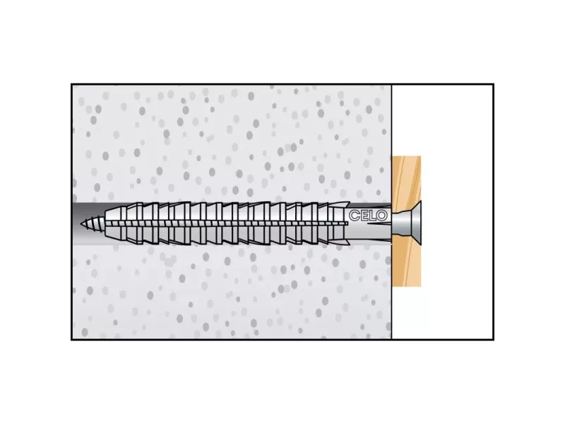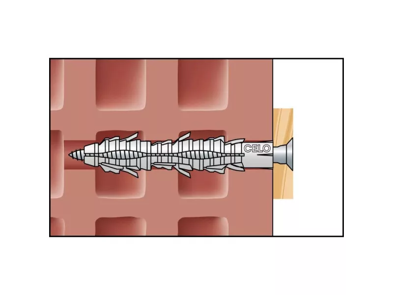 A CELO FL extra hosszú nylon dübel hosszú tágulási szakaszának köszönhetően egyformán használható tömör és üreges építőanyagokban, vagy porózus szerkezetekben (pl. öreg épületek). A gallér nélküli fejrész lehetővé teszi az átmenő szerelést. A szárnyas kialakítás megakadályozza az elforgást a furatban. A dübel kiváló minőségű, öregedésálló nylonból készül.