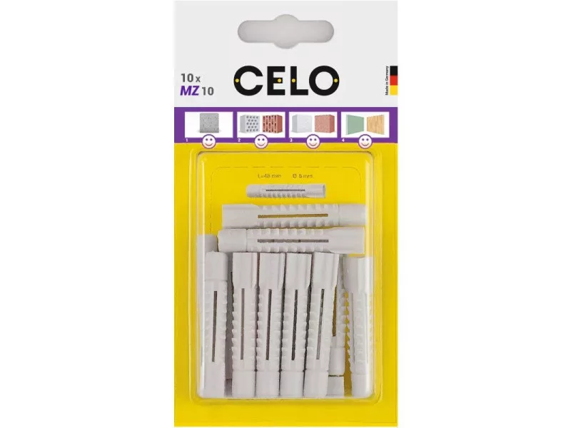 A CELO MZ univerzális dübel milliószor bizonyította kiválóságát és szinte az összes építőanyagban használható. A dübel 4 irányú tágulása a tömör anyagokban és csomózó effektusa üreges építőanyagokban és gipszkartonban, mindig megfelelő rögzítést biztosít magas terhelhetőséggel. Kompatibilis különböző típusú és méretű csavarokkal. Kiváló minőségű polietilént tartalmaz, amely garantálja az MZ univerzális dübel tartós rugalmasságát.