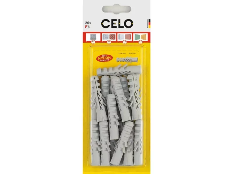 A CELO F általános dübel nagy tágulási képességének köszönhetően magas kihúzási értékekkel rendelkezik. Széles méret választékban kapható 4-20 mm átmérőig. Az F általános dübel ideális választás tömör építőanyagokhoz, de üreges tégla és pórusbeton szerkezetekben is jó terhelhetőségi értékekkel bír. Jó csavarvezetése miatt a csavar nem mozdul ki a behajtás során.Alkalmazások Lámpák Villanykapcsolók Fali fogas Fali szekrények Postaláda Függöny sín Szaniter rögzítések Korlát TV tartó FestményekTovábbi specifikációkFőbb jellemzők: Magas kihúzó érték a nagyfokú tágulásnak köszönhetően (4 irányú tágulás a középső részen) Központosított, nagyon jó csavarvezetés Jó elfordulási ellenállás Masszív felépítés, nem hajlik el a kalapálás során Kiváló kihúzó érték üreges és porózus anyagokban is Kiváló minőségű és öregedésálló nylon Hőállóság: -40°C-tól +80 °C-igAlapanyagok: GipszkartonTechnikai adatok Anyag Nylon Furat átmérő (mm) 12 Furat mélység (mm) 80 Rögzítési mélység (mm) 60 Dübel hossz (mm) 60 Csavar átmérő (mm) 8 - 10
