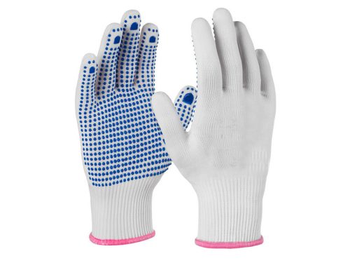 Varrás nélküli kötött kesztyű, elasztikus csuklórésszel100% poliamidból készültPVC pöttyök a tenyerén és az ujjakonA csúszásgátló felület kiváló tapadást biztosítKönnyű, kényelmes és rugalmas Technikai adatok: Típus: kötött Anyag: poliamid Bevonat: PVC pöttyök Csuklórész: elasztikus Súly: könnyű Szín: fehér, kék Méret: 10 Alkalmazása Elektronikai szerelésnélEnyhén zsíros felületekenTárgyak összeszerelésénél és precíziós munkáknálÜgyességet és tapadást igénylő munkákhoz
