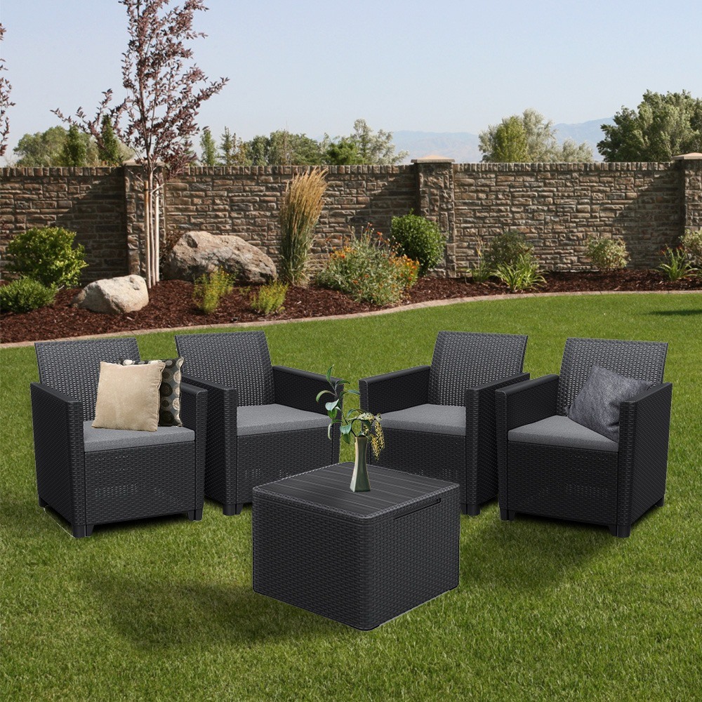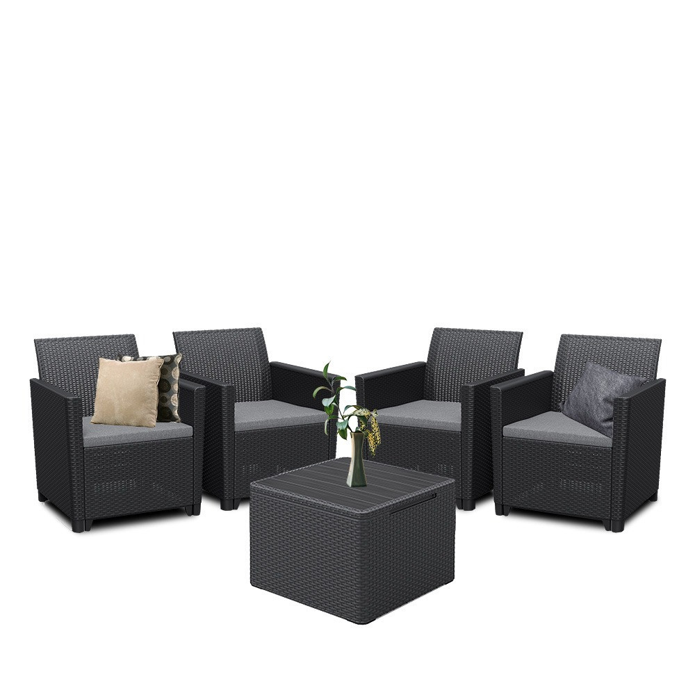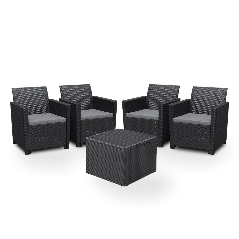Ez egy rattan stílusra emlékeztető elegáns bútor szett négy fotellel és egy párnatartós asztallal. Ez a bútor szett kellemessé teszi a kertben vagy a teraszon töltött nyári napokat. A könnyű és egyúttal stabil szerkezetű bútorok tisztítása nagyon egyszerű. A szett ellenálló a sérülésekkel és az időjárás hosszan tartó viszontagságaival, illetve az UV sugárzással szemben is.