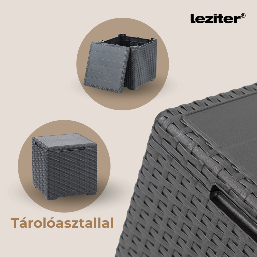 Ez a Grafit színű rattan hatású kerti bútor szett két fotellel, két 3 személyes sarokkanapéval és egy tárolós asztallal rendelkezik, amelyeket időjárásálló műanyagból készítettek, így nem kell aggódnod a UV sugárzás hatásaitól sem. A fotel magassága: 74 cm, szélessége: 63 cm, hossza: 65 cm. A fotel és a kanapé párnával rendelkezik, mely kényelmessé teszi és színben passzol a bútorhoz. Az asztal magassága: 37 cm, szélessége: 37 cm, hossza: 37. Az asztal több funkciós, így a tároló részében elrejtheted a kerti eszközöket.