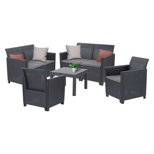 A fotelek és a kanapé kialakítása megfelelő háttámaszt biztosít, a szürke ülőpárnák pedig gondoskodnak a kényelmes pihenésről a szabadban.