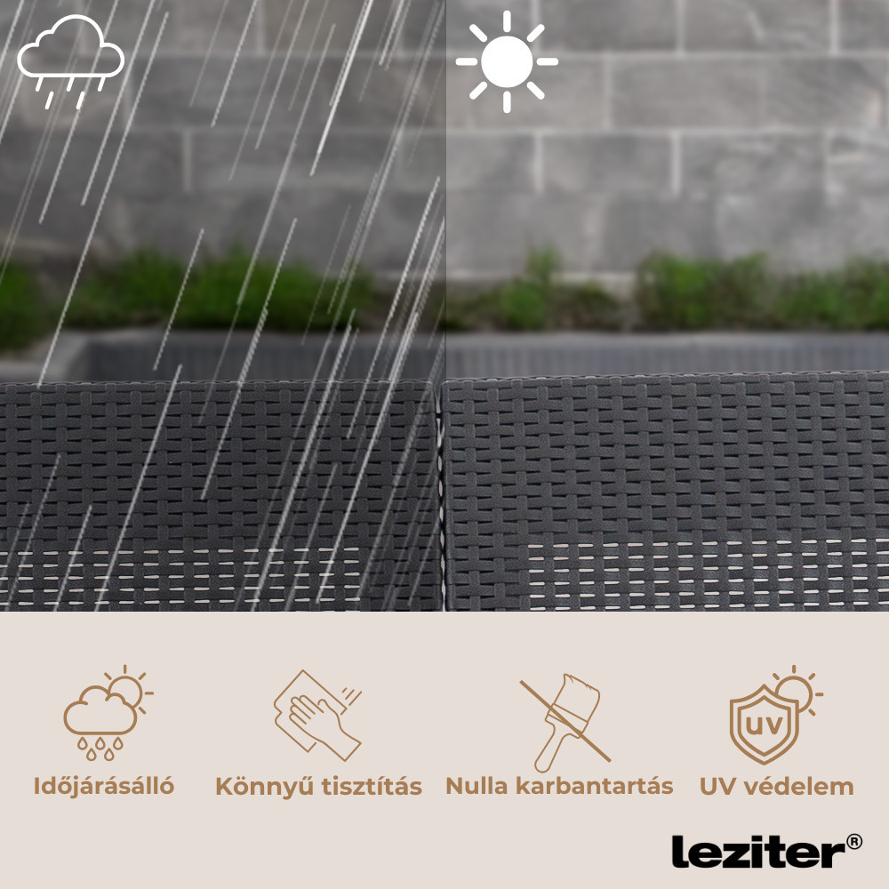 A garnitúra kiváló minőségű, időjárásálló anyagokból készült, amelyek ellenállnak az UV-sugárzásnak, esőnek és szennyeződéseknek. Karbantartást gyakorlatilag nem igényel – csak élvezni kell.