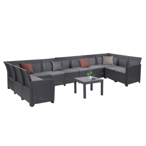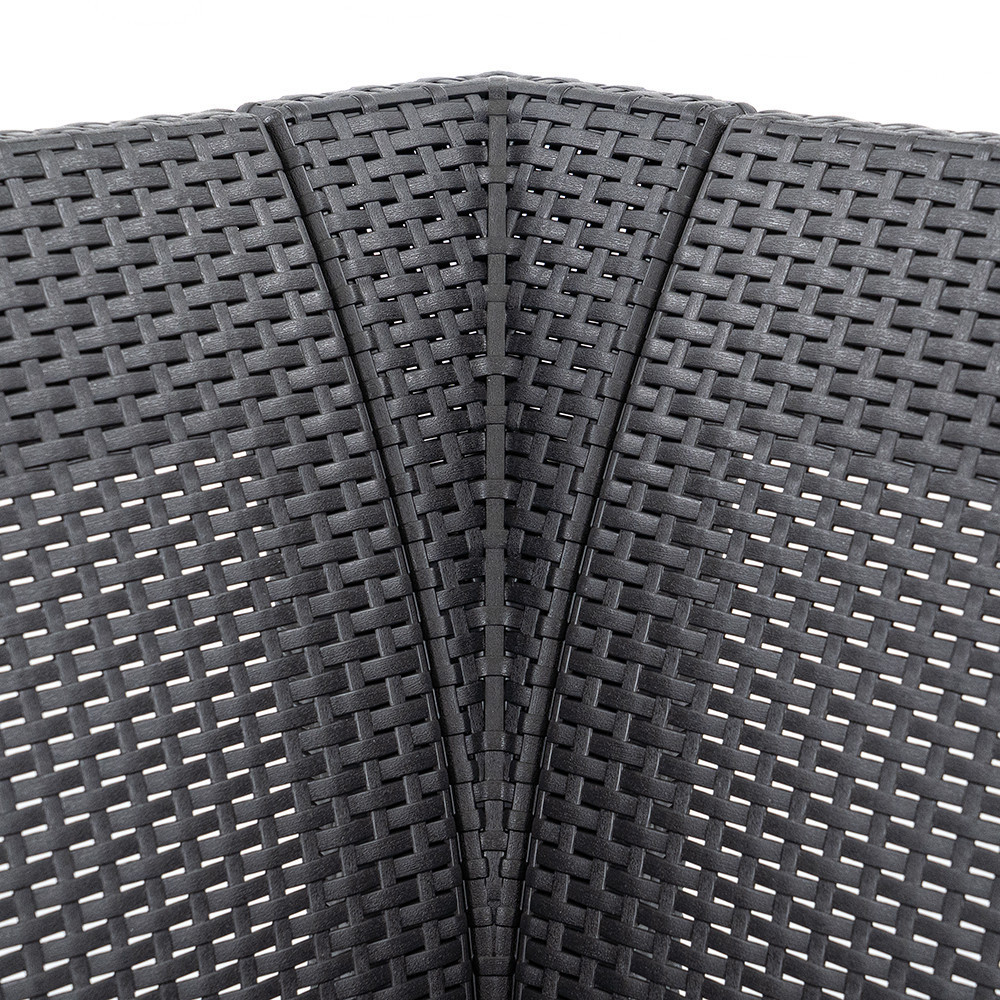 A kerti garnitúra modern rattan hatású borítást kapott, ami gyönyörű megjelenést biztosít, de nem igényel karbantartást. A szürke ülőpárnák extra kényelmet adnak – mindezt egy könnyen tisztítható, időjárásálló és UV-védett felületen.