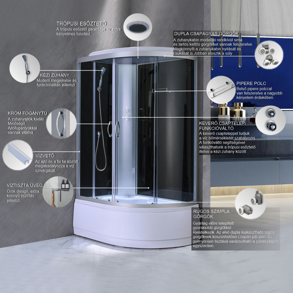 A Cora zuhanykabin számos hasznos funkcióval rendelkezik. Pipere polccal van felszerelve, melynek köszönhetően rendben lehet tartani a tisztálkodáshoz szükséges eszközeit. Trópusi esőztetővel és kézi zuhannyal is rendelkezik, melyet a funkcióváltóval lehet váltakoztatni. A víz hőmérsékletét a keverő csapteleppel lehet beállítani. A trópusi esőztető mellett helyezkedik el kettő szellőző, melyeknek köszönhetően távozik a felesleges meleg gőz ezzel megakadályozva a kabin párásodását.*Biztonsági üveg: A biztonsági üveg egyik nagy előnye, hogy erőhatásra nem történik az üvegben törés. Az edzett üveg ellenáll az őt ért külső erőhatásoknak, melynek köszönhetően igen csak tartós és strapabíró. Magasabb a hőmérsékleti ellenállása. Ezen tulajdonságait egy viszonylag egyszerű hőkezeléssel érik el, amelynek során a méretre vágott üveglapot kb. 650 fokra hevítik, majd hideg levegővel lefújják.