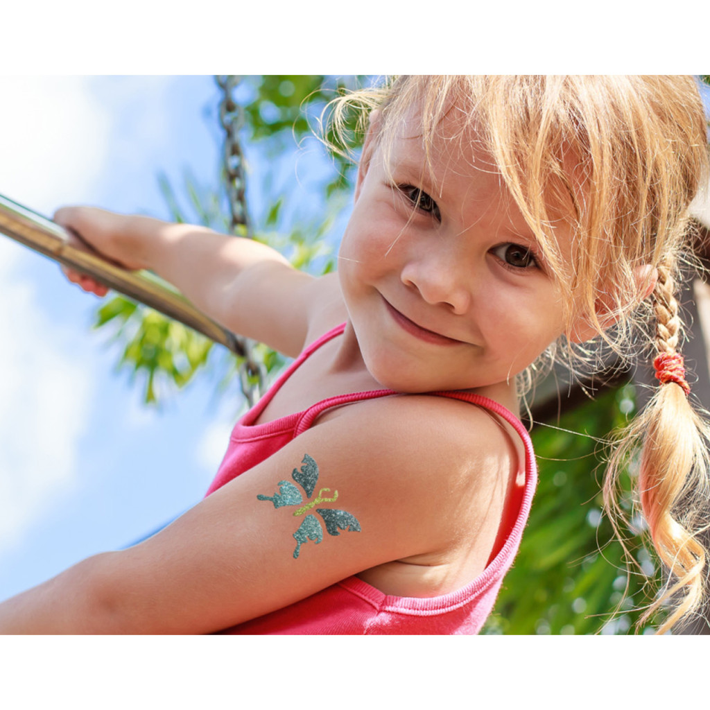 • A legerősebb nyári napfényben is élénk színű marad, így gyermeke sokáig élvezheti a csillogó tetoválását