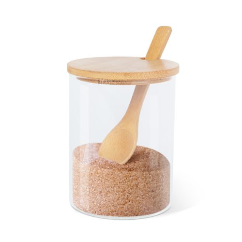 Átlátszó üveg fűszertartó, fából készült tetővel és kanállal. Bármilyen fűszer, só, cukor tárolására alkalmas. Az átlátszó tartó miatt könnyen nyomonkövetheti a fűszer mennyiségét és megtalálja azt a fűszert, amire éppen szüksége van. Igény esetén cimkézhető is.