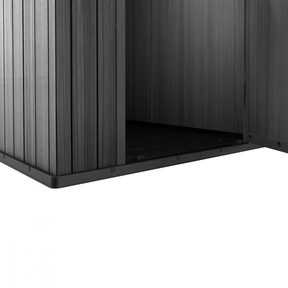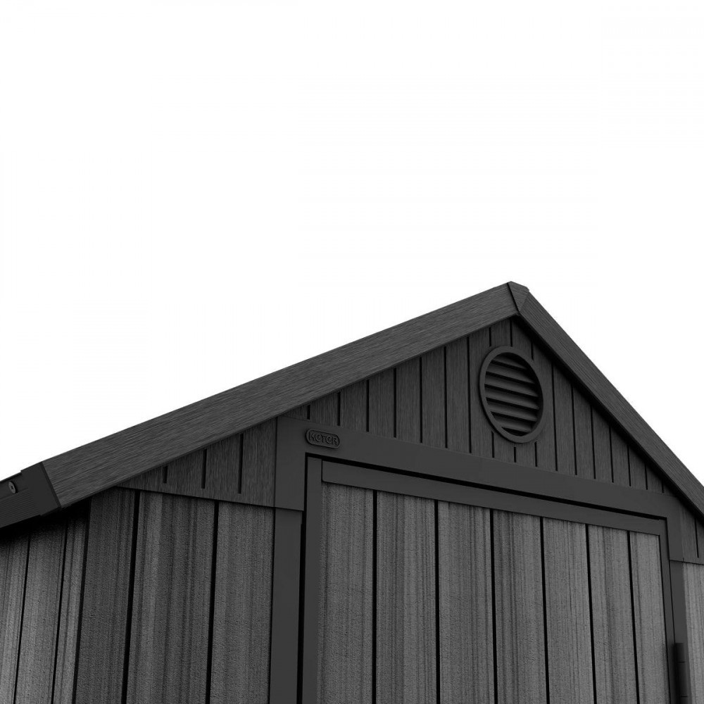 A Darwin 4x6 műanyagból készült kerti ház kiváló választás kertje számára - a műanyag, amelyből a ház tökéletesen tükrözi a sötétszürkére színezett természetes fa szerkezetét és megjelenését - első pillantásra az anyagok megkülönböztethetetlenek. Ez az anyag 100% vízálló és ellenáll az UV sugárzásnak.