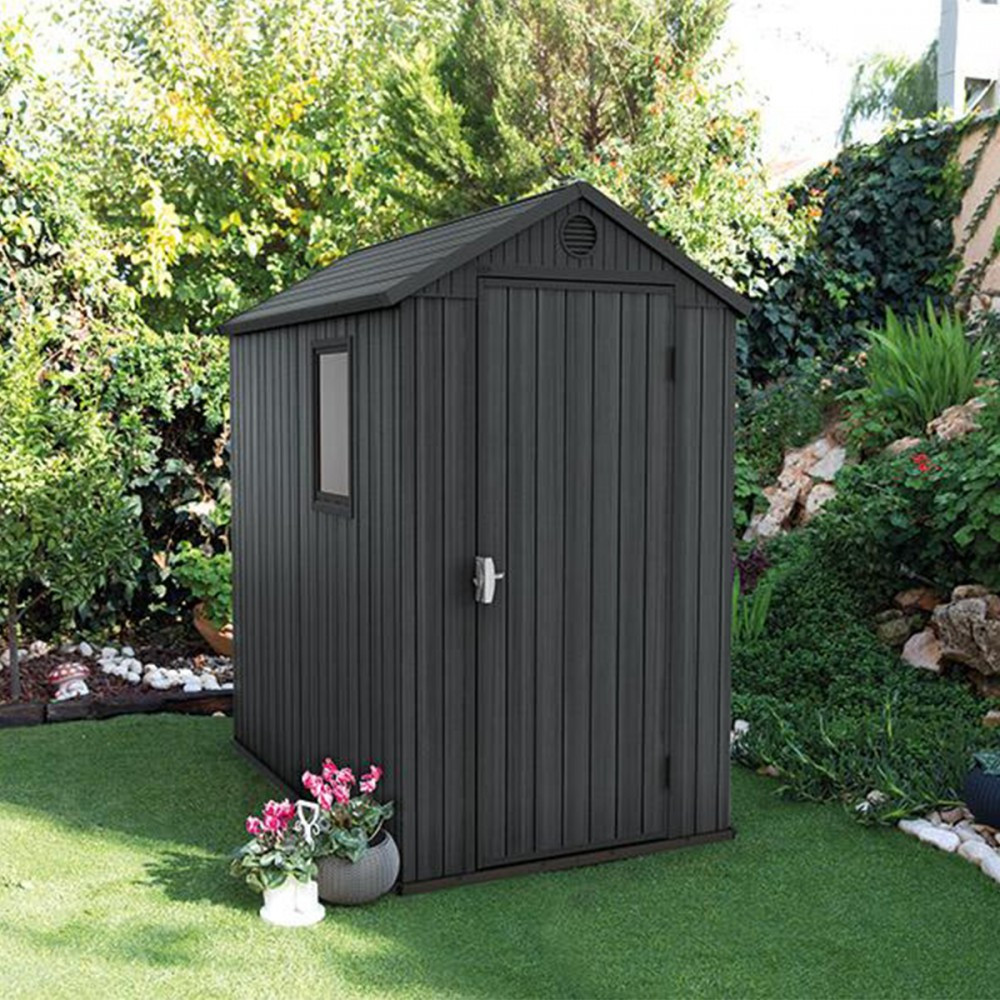 A Darwin 4x6 grafit műanyag kerti ház univerzális és átfogó megoldás a kert számára. A termék 205 cm magas, 126 cm széles és 185 cm mély. A ház belső tere 2,5 m2 hasznos terület, ahol sikeresen tárolhat kerti szerszámokat, fűnyírót, játékokat és bútorokat is.