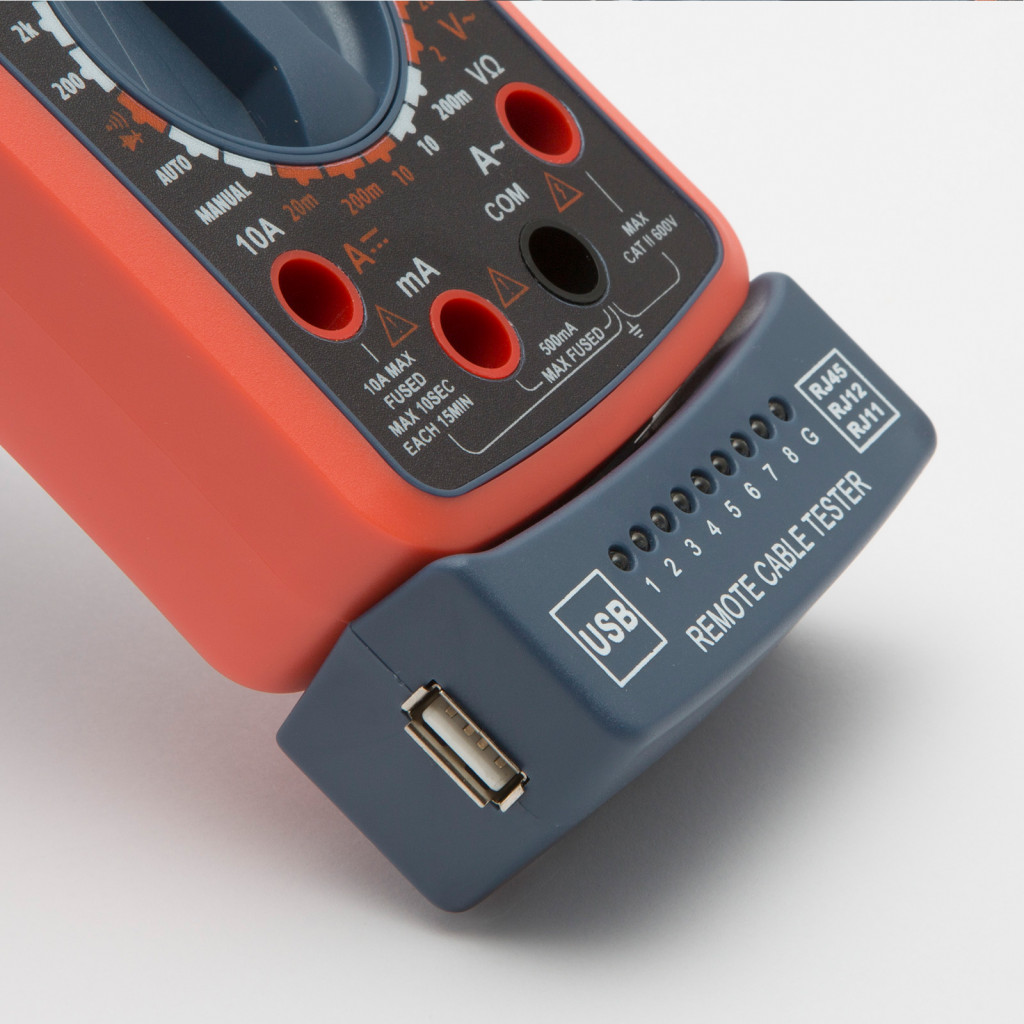 2 az 1-ben műszer, általános multiméter funkciókkal, kábeltesztelő egységgel kiegészítve. A kontroll egység levehető és szabadon hordozható. RJ11, RJ12, RJ45 és USB vezetékek teszteléséhez alkalmazható.