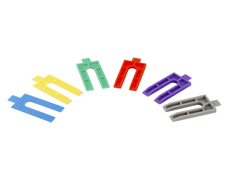 különböző vastagságú műanyag távtartó készlet, alapozási profilok egyenetlen felületeken történő alapozására és kiegyenlítésére a készletben minden szín egy vastagságnak felel meg 1, 2, 3, 4, 5, 6 mm mennyiségben 5 darabból a formának köszönhetően az egyes határoló párnák kombinálhatók és kiegészítőleg alkalmazhatók az alapprofilok legpontosabb síkságának elérése érdekében a fal teljes hosszában