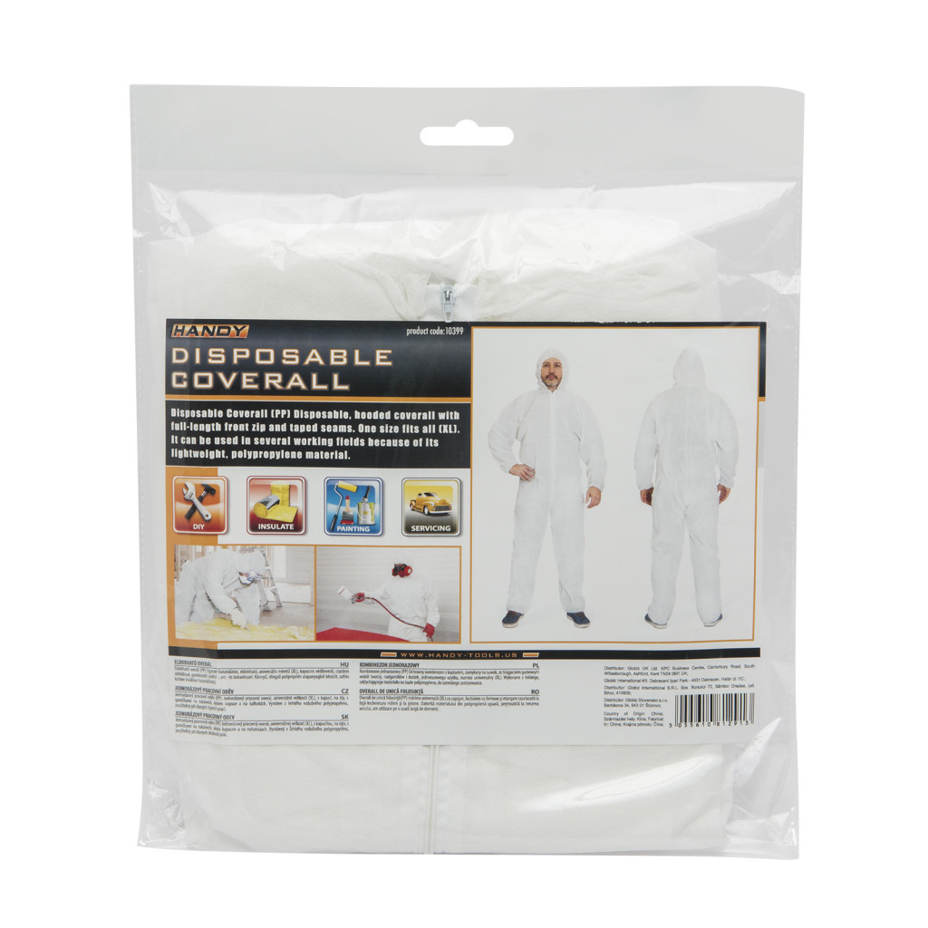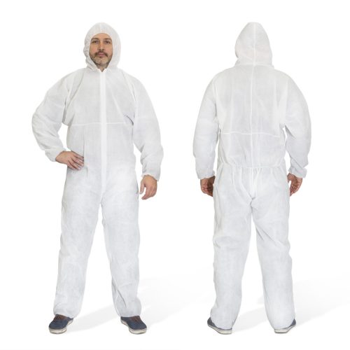Egyszer használatos, eldobható, univerzális méretű (XL), kapucnis védőoverál, cipzáras záródással, gumírozott csukló -, arc - és bokarésszel. Könnyű, lélegző polipropilén alapanyagból készült, széles körben kiválóan használható.