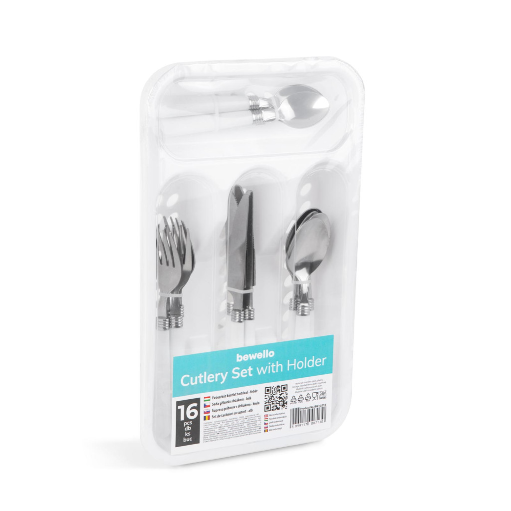 Evőeszköz készlet tartóval - fehér - 16 részes - 32,7 x 19,5 x 4,7 cm