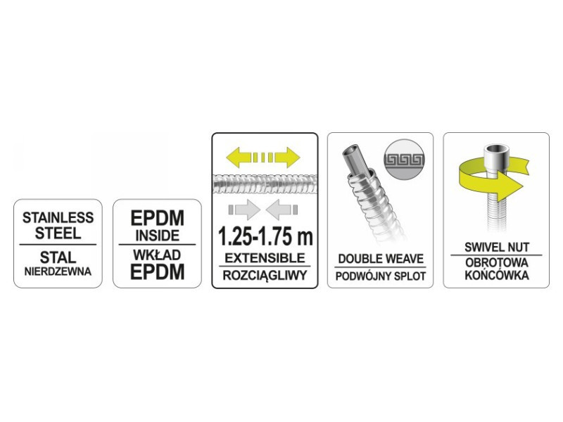 Univerzális Wave zuhanyzó tömlők kiegészítik a hiányos zuhany- és fürdőcsaptelepet vagy helyettesítik a sérült tömlőt. Elérhető hosszúságok lehetővé teszik a tökéletes illeszkedést a csaptelephez, biztosítva a kényelmes használatot. Kiváló minőségű anyagokból készült. A 75650-es zuhany tömlő jellemzői: hossza 1.25 - 1.7 m (kinyújtható) kettős szövésű krómozott rozsdamentes acél szövés magas fényű univerzális G1/2" réz anya forgatható csúcs (megakadályozza a csavarodást) Paraméterek: menet: G1/2" befejezés: króm fényezés anyag: rozsdamentes acél, EDPM gumi szín: króm tömlő hossza [cm]: 125-175 Csomag tartalma: zuhany tömlő 2 db 1/2 " tömítés .