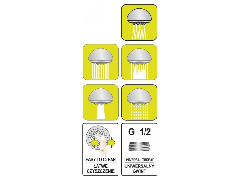 A zuhanyfej modern formával rendelkezik, mely összhangban van a legújabb divatirányzatokkal. Tartós és szilárdan készült. A beépített vízszabályozó csökkenti a vízfogyasztást. A gumicsatornák megakadályozzák a vízkő felhalmozódását. Standard G1/2 " menet Nedvességálló bevonat Vízsugár szabályozó. A zuhanyfej 5 fúvókafunkcióval rendelkezik: zuhany kisméretű zuhany masszázs masszázs + zuhany pára + zuhany
