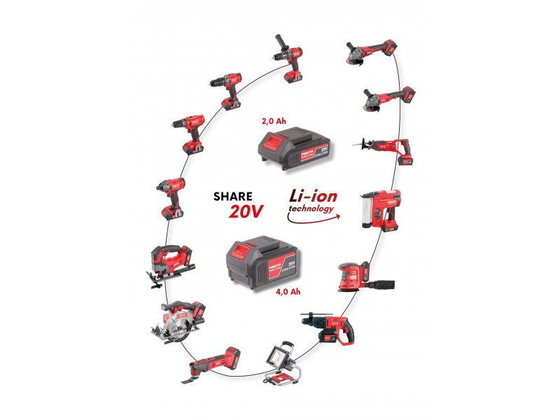 A FESTA SHARE 20 V – akkus sarokcsiszoló egy termékcsoport része, amely 2,0 Ah és 4,0 Ah Li-ion akkumulátorokkal használatók minden ilyen jelzéssel ellátott gépben