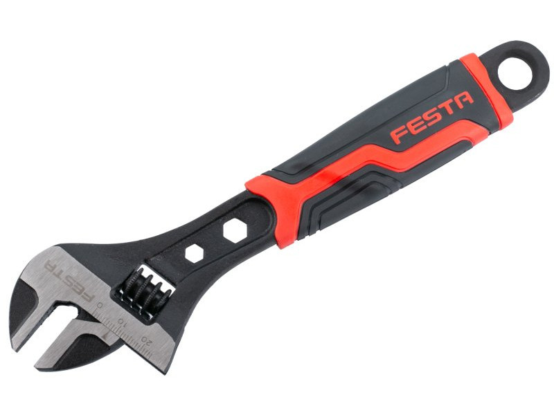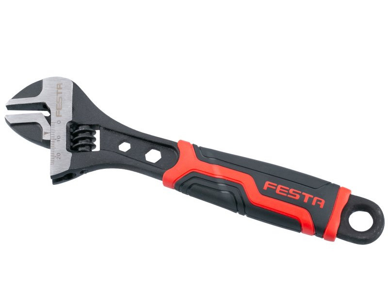 állítható csavarkulcs FESTA 200 mm (8") minőségi króm-vanádium acél indikatív milliméteres skála rögzített pofán - tartománybeállítás anyákhoz és csavarok max 29 mm, precíz mozgás és a kívánt méret beállítása lágyított gumiból készült ergonomikus fogantyú a szilárd ill. csúszásmentes markolat, fül a felfüggesztéshez