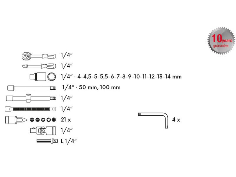 A kiváló minőségű gola készlet a felhasznált anyagok minősége és a professzionális autóműhelyben vagy szervizben történő feldolgozás miatt megfelelő. 10 év garancia. Minden alkatrész kiváló minőségű króm-vanádium acélból készül. Nikkel bevonat. A fúróhegyek S2 ötvözött acélból készültek. A racsnis 72 fogas finom felosztású, a racsnis teste CrV acélból, a fogszerkezet S2 acélból készült, a fogantyú pedig ergonomikus kialakítású, ártalmatlan gumival. Új kialakítású, elsődleges anyagból készült műanyag tok fém záródással és fedél zsanérokkal.