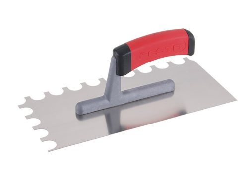 Rozsdamentes fogazott simító FESTA 280x130 mm, O16 fogú, gumi nyéllel, lemezvastagság 0,8 mm. A teherhordó területeken a burkolat alatti ragasztó nyújtására szolgál.
