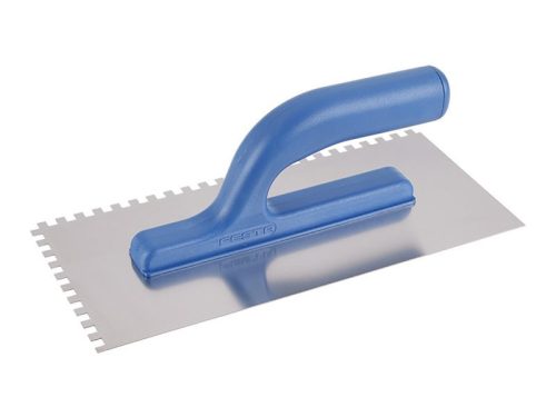 Rozsdamentes fogazott simító FESTA 280x130 mm, e6 fogú, műanyag nyéllel, lemezvastagság 0,8 mm. Elsősorban csempék és burkolatok alá ragasztók felhordására, valamint esztrichek, stukkó, vakolatok, tömítőanyagok és egyéb építőanyagok felhordására használják. A rozsdamentes fogazott simító lehetővé teszi a ragasztó vagy építőanyag nyújtását csíkokban és a simító fogának megfelelő magasságban.