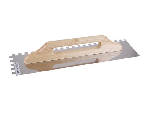 Rozsdamentes fogazott simító FESTA 500x130 mm, e12 fog, fa nyéllel, lemezvastagság 0,7 mm. Elsősorban csempék és burkolatok alá ragasztók felhordására, valamint esztrichek, stukkó, vakolatok, tömítőanyagok és egyéb építőanyagok felhordására használják. A rozsdamentes fogazott simító lehetővé teszi a ragasztó vagy építőanyag nyújtását csíkokban és a simító fogának megfelelő magasságban.