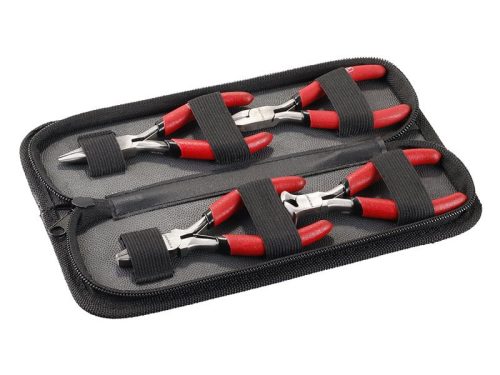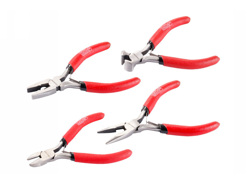 Mini fogó készlet (110mm) praktikus zárható tokban, a készlet tartalma: kombinált, rádiós, oldalsó és elülső vágófogó, gumírozott fogantyúk, kényes műhelymunkához.
