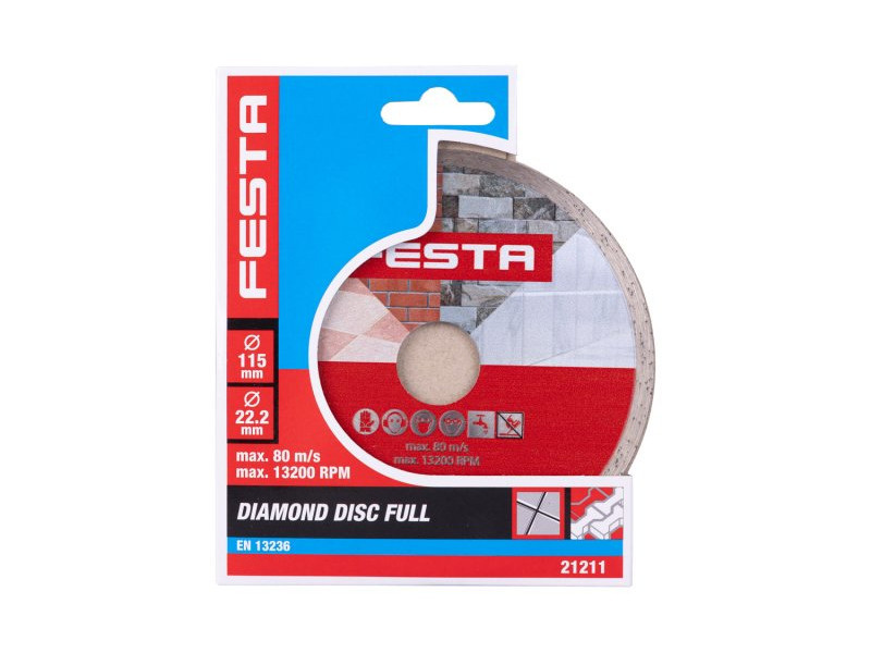 FESTA professzionális gyémántpenge, kivitel: FULL - körbefutó, kiváló minőségű gyémántréteg magas gyémántpor tartalommal, precíz megmunkálás - magas hőmérsékletnek ellenálló tárcsatartó koronghoz való csatlakozás, felhasználás: burkolat nedves és száraz vágására szolgál és csempézés, beton, tégla, falazat, gránit, márvány, kő, üveg, kerámia, csomagolás: eurólyukkal ellátott buborékfólia, méretek: a termék megnevezésében szerepel.