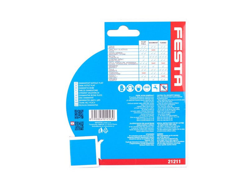 FESTA professzionális gyémántpenge, kivitel: FULL - körbefutó, kiváló minőségű gyémántréteg magas gyémántpor tartalommal, precíz megmunkálás - magas hőmérsékletnek ellenálló tárcsatartó koronghoz való csatlakozás, felhasználás: burkolat nedves és száraz vágására szolgál és csempézés, beton, tégla, falazat, gránit, márvány, kő, üveg, kerámia, csomagolás: eurólyukkal ellátott buborékfólia, méretek: a termék megnevezésében szerepel. Oktató videó