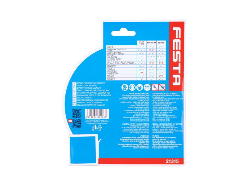 FESTA professzionális gyémántpenge, kialakítás: SZEGMENTES, kiváló minőségű anyagok és megmunkálás - a gyémánt szegmensek nagy szilárdságú rögzítése a penge tartótárcsájához, magas gyémántpor tartalom a szegmensekben, felhasználás: beton, tégla száraz vágásához , falazat, kő, ..., csomagolás: eurólyukkal ellátott buborékfólia, méretek: a termék megnevezésében szerepel.