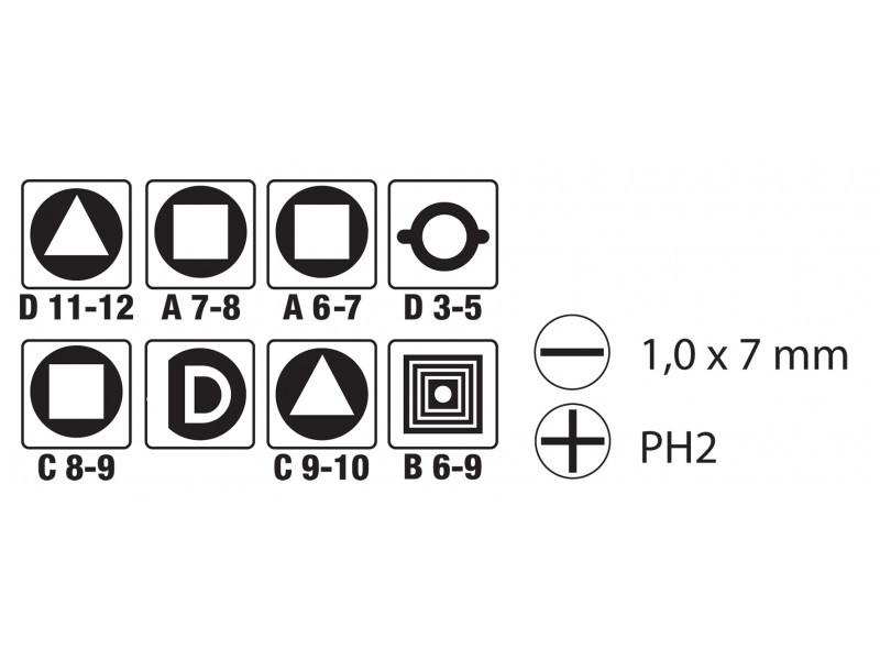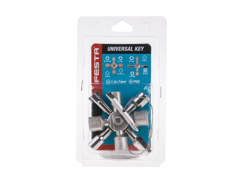 univerzális kulcs elektromos kapcsolótáblák, gáz- és vízcsapok nyitásához, légkondicionáláshoz, szellőzéshez és fűtés szellőztetéséhez ablak- vagy ajtókilincsekhez és kéményajtókhoz is alkalmas kétoldalas lapos bittel kiegészítve 1 x 7 mm / PH2