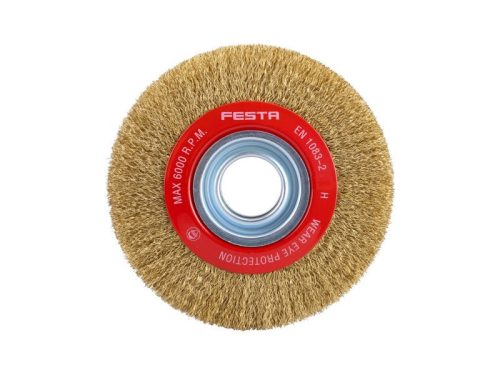 Forgókefe - kör alakú, kialakítás: hullámos huzal, FESTA kefék garantálják a minőségi felhasznált anyagokat és feldolgozást, huzal 0,3 mm - sárgaréz, átmérő 150 mm, rögzítési furat 32 mm (beleértve a szűkítő gyűrűket 12,7 mm - 1/2, 15,8 mm - 5 /8, 19 mm - 3/4, 22,2 mm és 25,4 mm - 1), vezetékek száma 7200, huzalhossz 30 mm, maximális fordulatszám percenként. 6000, lakatos és fémmegmunkálási munkákra alkalmas, rozsda eltávolítás, festék, polírozás..., csomagolás: papírdoboz.