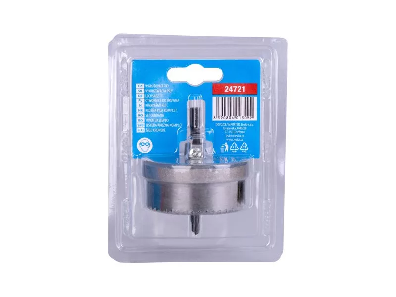 Körfűrész készlet fához, gipszkartonhoz, forgácslaphoz stb., fúróhoz rögzítve. A készlet 7 db 26, 32, 38, 45, 50, 56 és 63 mm átmérőjű fűrészt tartalmaz.