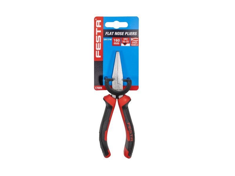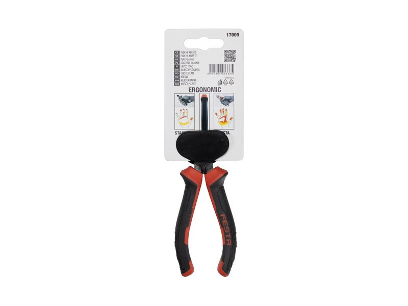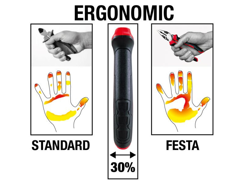 minőségi FESTA lapos fogó szénacél, indukciósan edzett pofák keménység 50-55 HRC korróziógátló kezeléssel ergonomikus kétkomponensű lágyított fogantyú, 30%-kal több érintkezés a fogantyúval megfogáskor és nyomáskor – csökkenti a szükséges erőt a gyártó az ISO 90001 tanúsítvány tulajdonosa